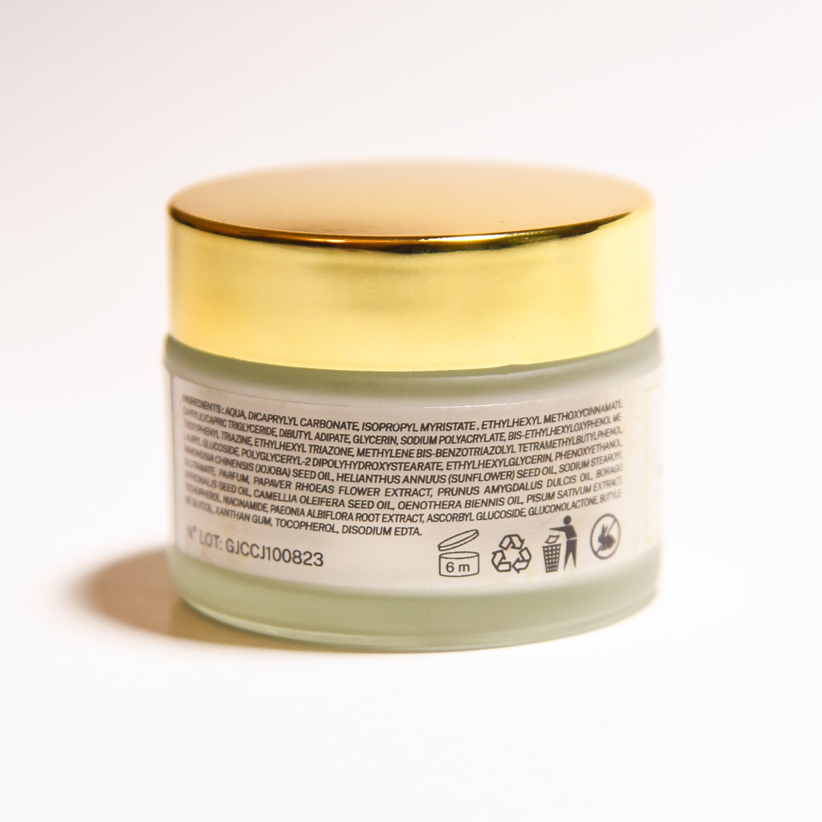 Substances Actives : Huile de Jojoba, Huile d’Amande Douce, Huile de Graine de Bourrache, Huile de Camélia, Huile d’Onagre, Extrait de Pois cultivé, Gluconolactone, Extrait de Racine de Pivoine Chinoise, Vitamine E, Vitamine B3, Vitamine C